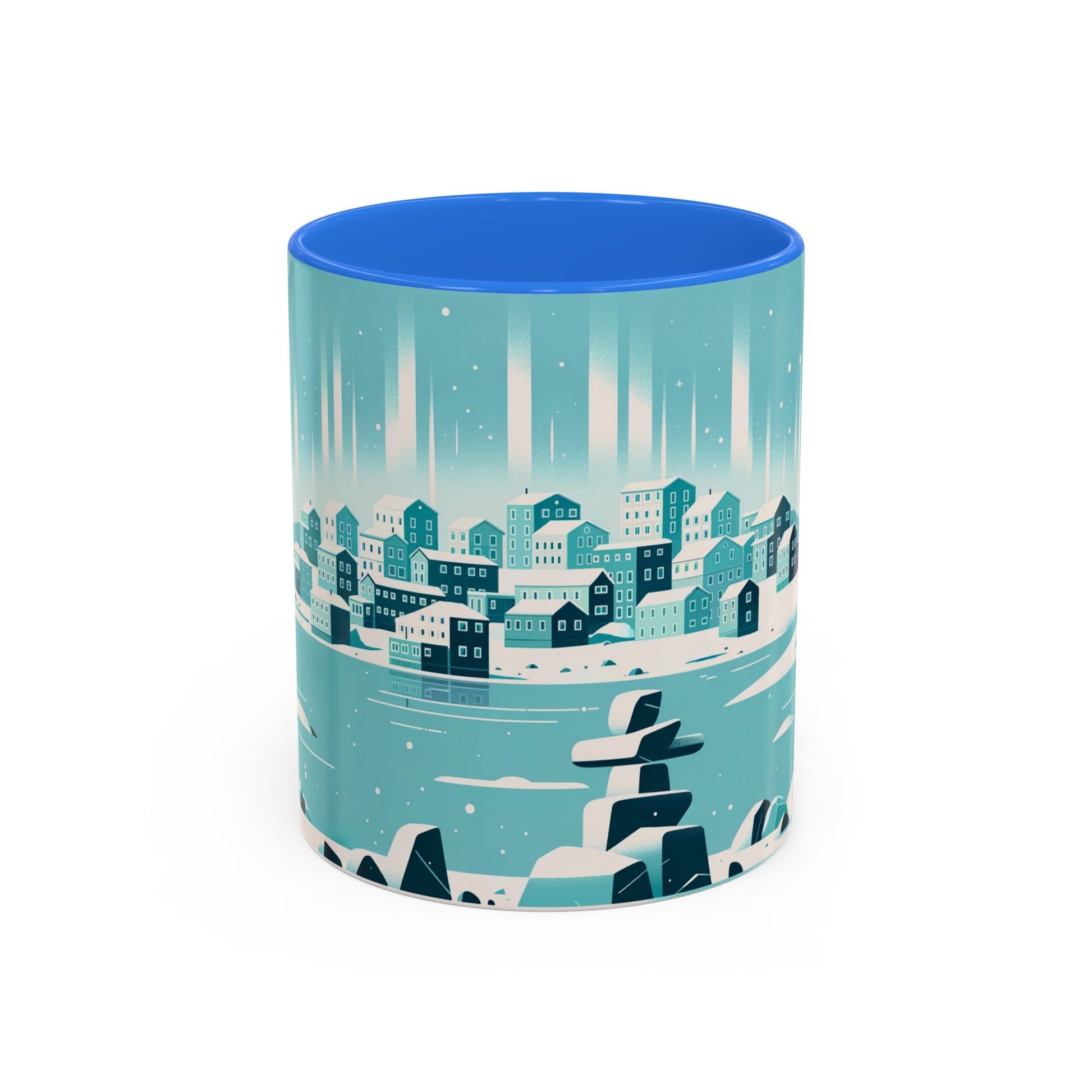 Start your day with the serene beauty of the Arctic with this Iqaluit, Nunavut coffee mug. An iconic Inuksuk stands proudly in the foreground, while the northern lights dance across the winter sky. Ideal for lovers of northern landscapes, this mug is a perfect blend of art and functionality, making each sip a peaceful escape.