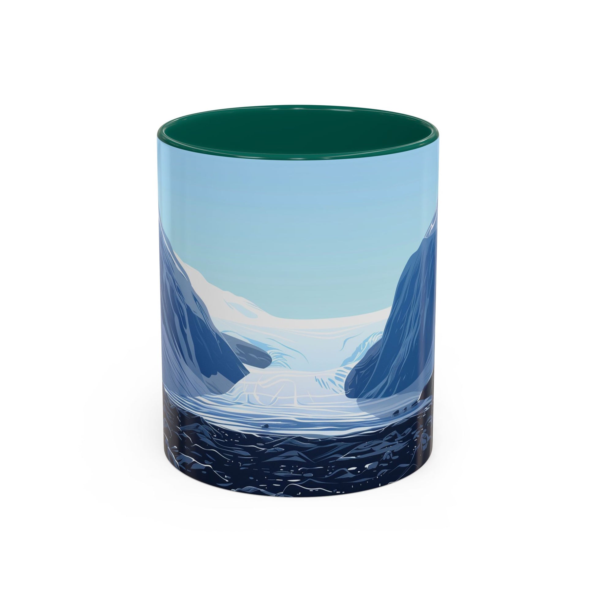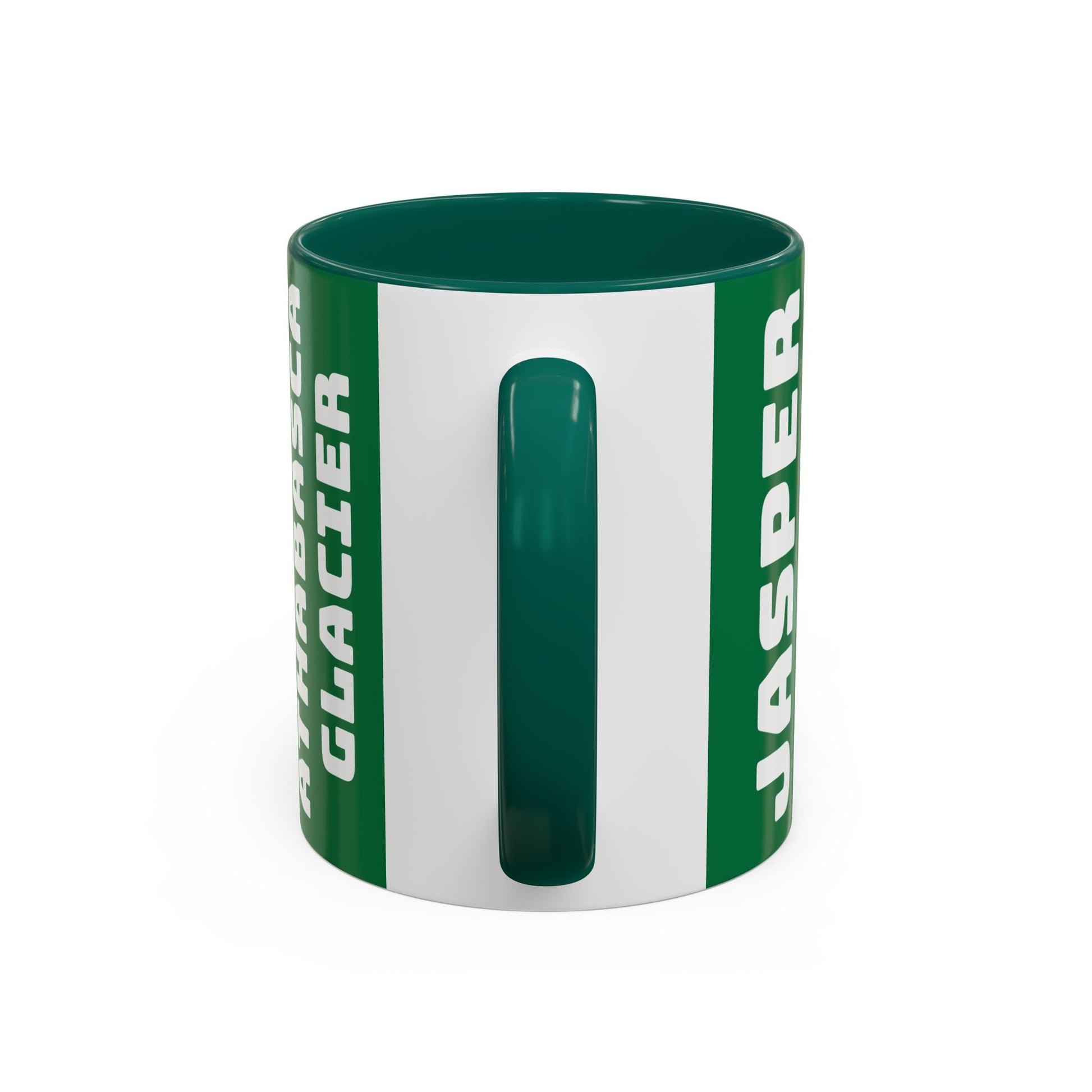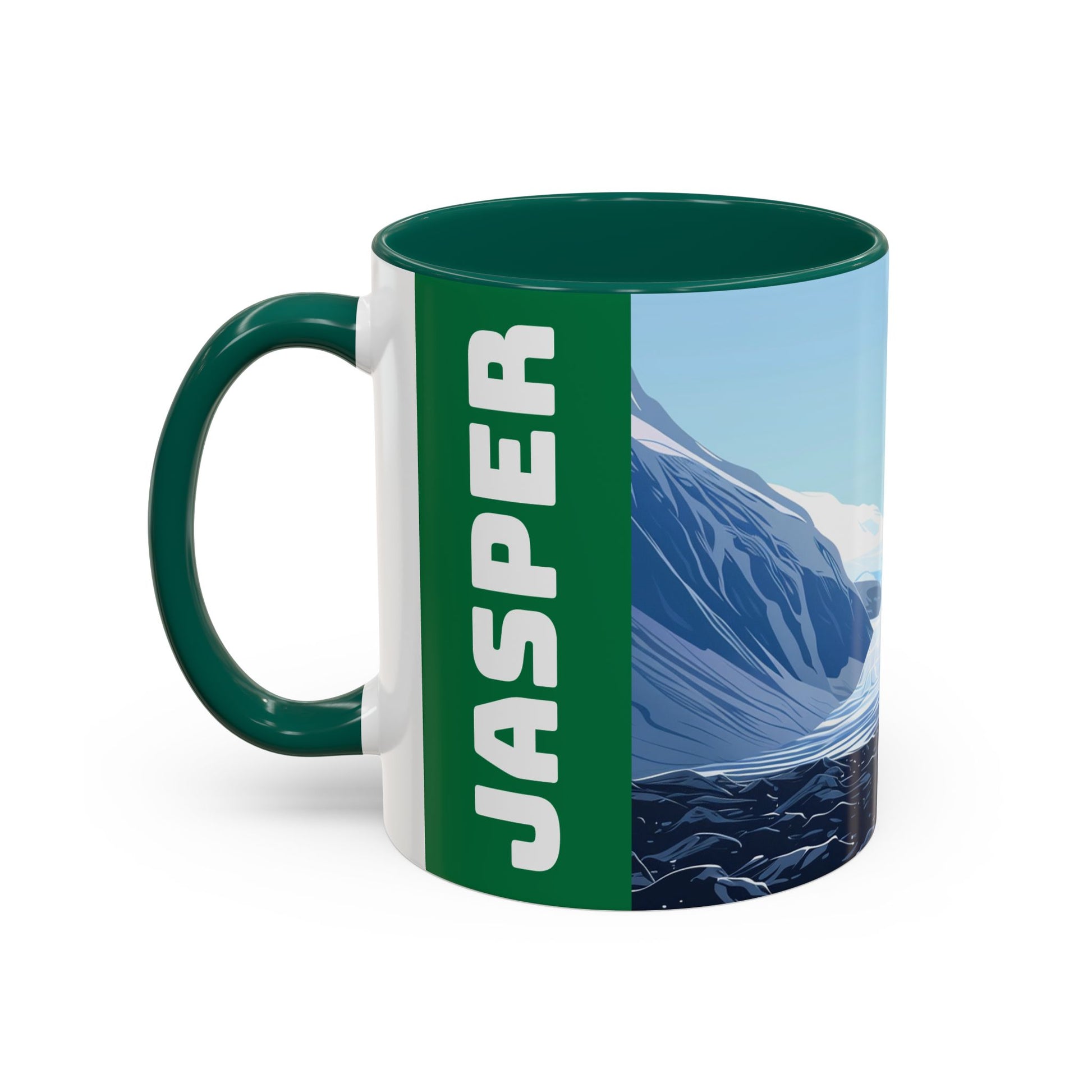 The coffee mug features a breathtaking image of the Athabasca Glacier in Jasper National Park. The glacier's surface is highlighted with intricate details of the ice flows and ridges, giving a sense of its immense size and natural beauty. This stunning depiction of the Athabasca Glacier showcases the raw, untouched beauty of one of Canada's most iconic natural wonders.