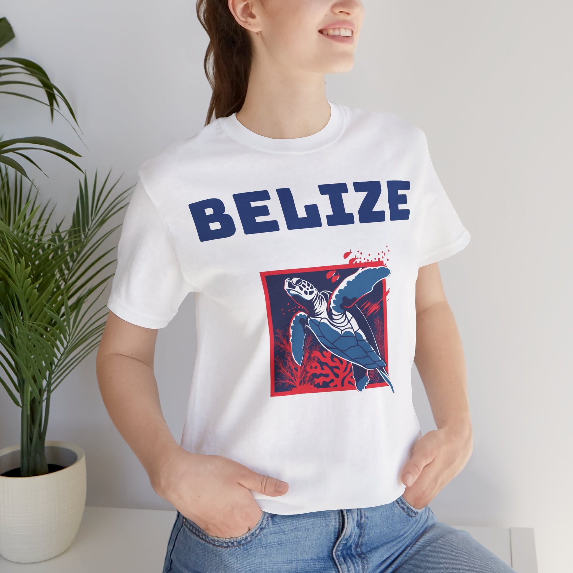 Just off Belize’s coast stretches one of the most biodiverse reefs on the planet — where sea turtles drift past coral forests and the water flows with the kind of calm that makes you forget about time. This design puts that world front and center: turtle, reef, nothing extra.
