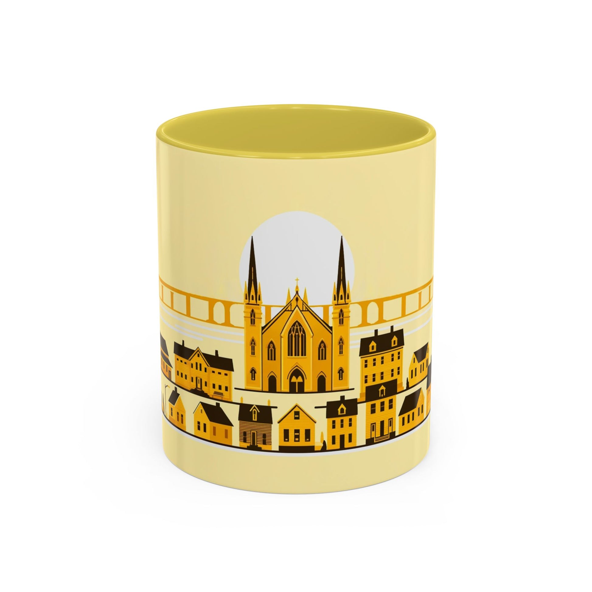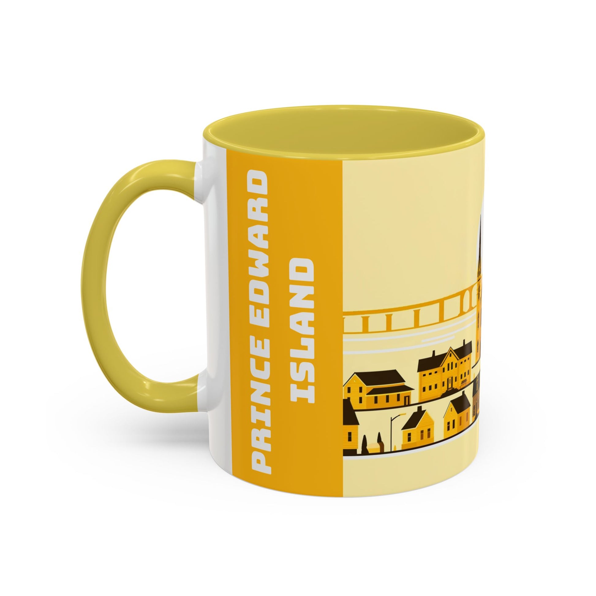 Start your day with a touch of maritime charm with this beautifully designed coffee mug. Featuring a minimalist illustration of Charlottetown, this mug captures the serene essence of this picturesque city. The artwork highlights the city's unique architectural style, with charming colonial houses and a harmonious blend of geometric shapes in warm yellow tones. The scene exudes calm and tranquility, making it the perfect companion for your morning coffee or tea.
