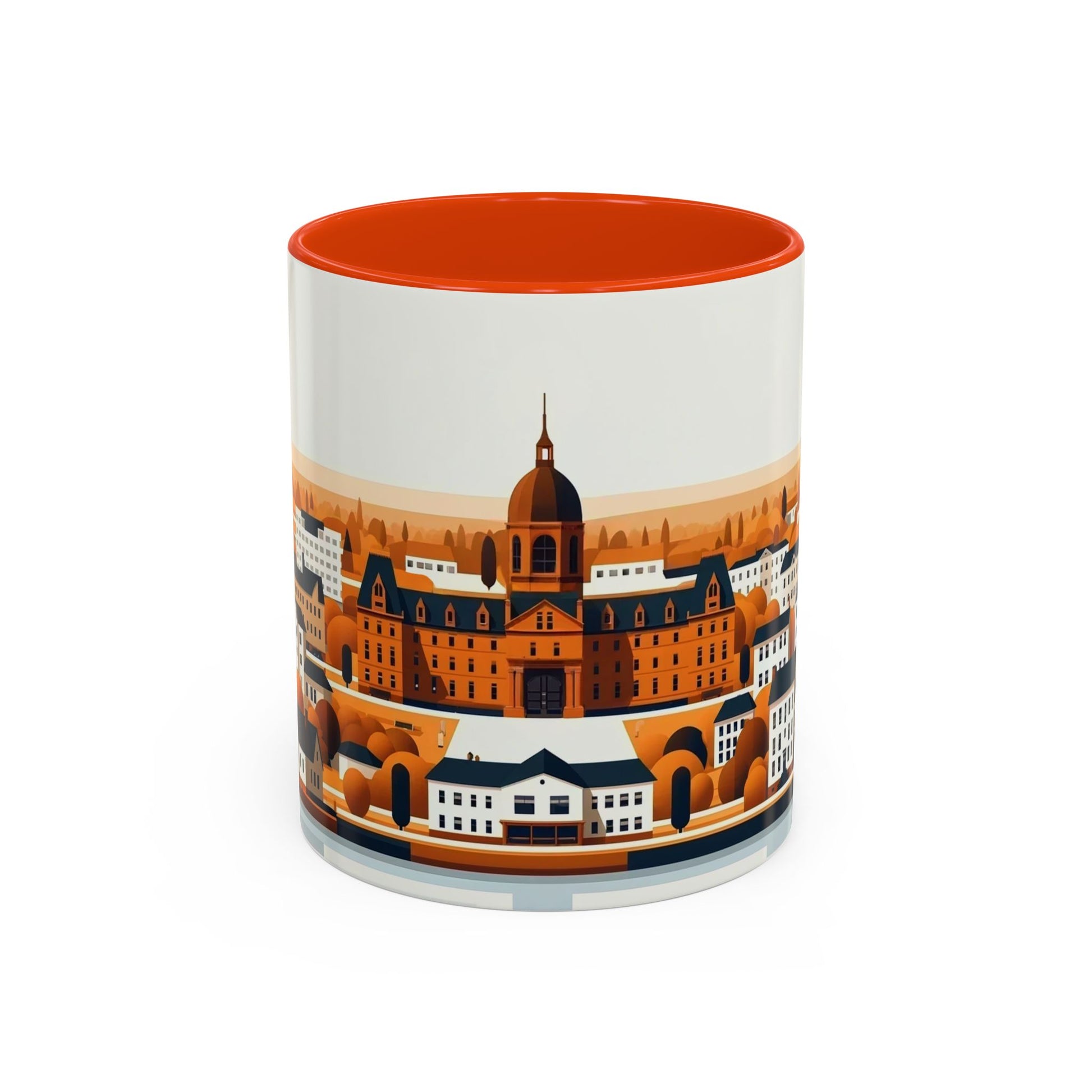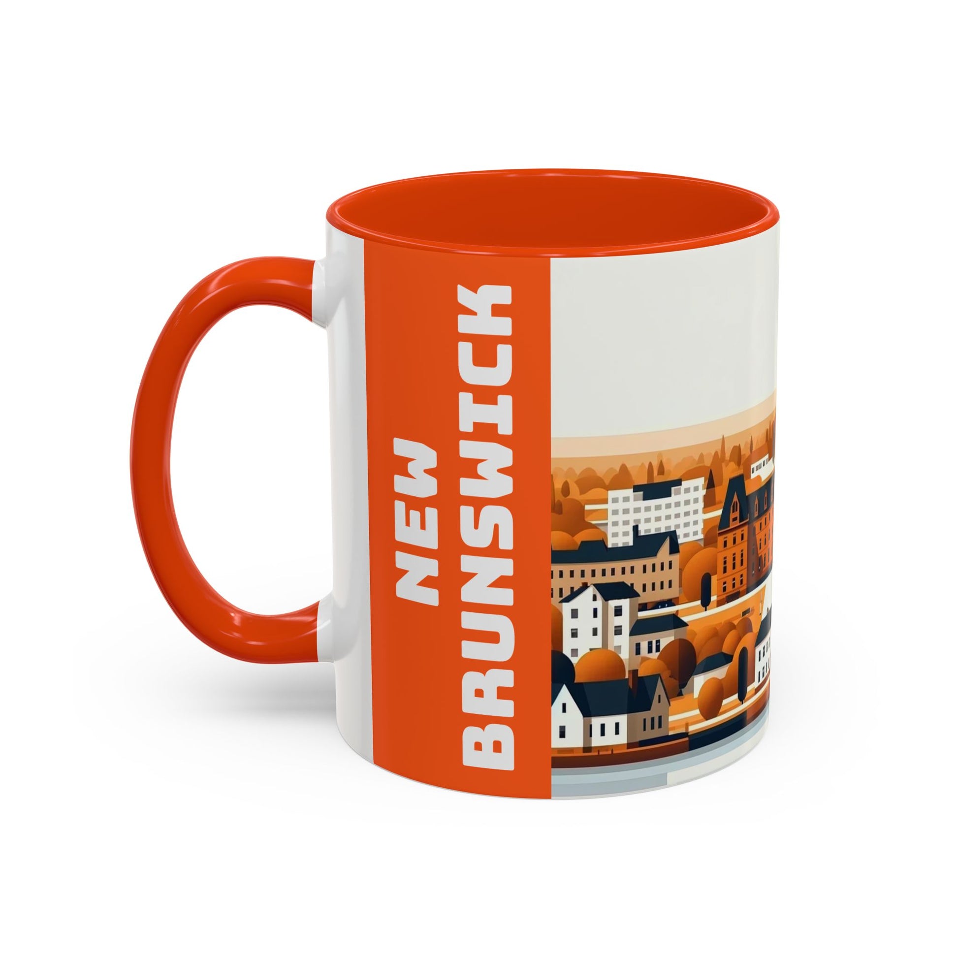 This coffee mug features a serene and picturesque representation of Fredericton, New Brunswick, capturing the essence of its natural beauty and vibrant community. The foreground highlights the tranquil waters of the St John River. Charming homes and buildings with distinct architectural styles are depicted in a harmonious blend of pastel colors. The sky above transitions from dawn to dusk, adding a sense of calm and timelessness to the scene. The overall aesthetic of the mug embodies the serene and welcoming spirit of Fredericton, perfect for enjoying your favorite beverage.