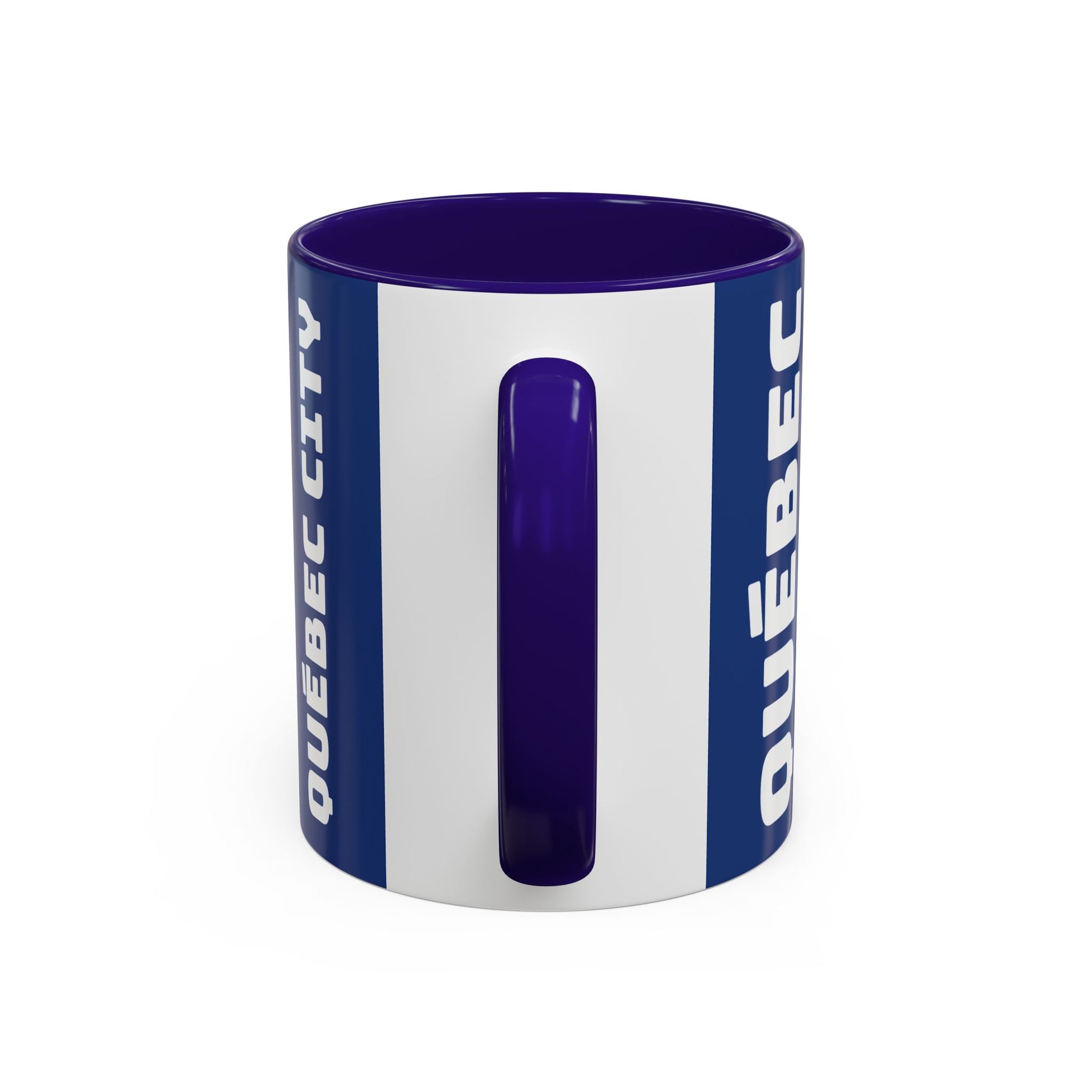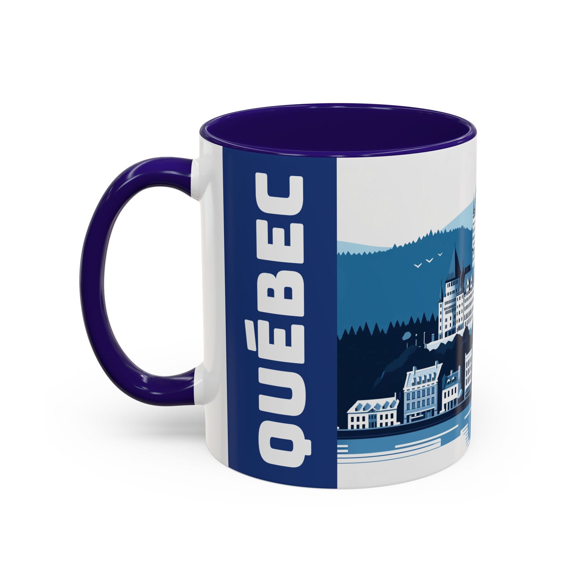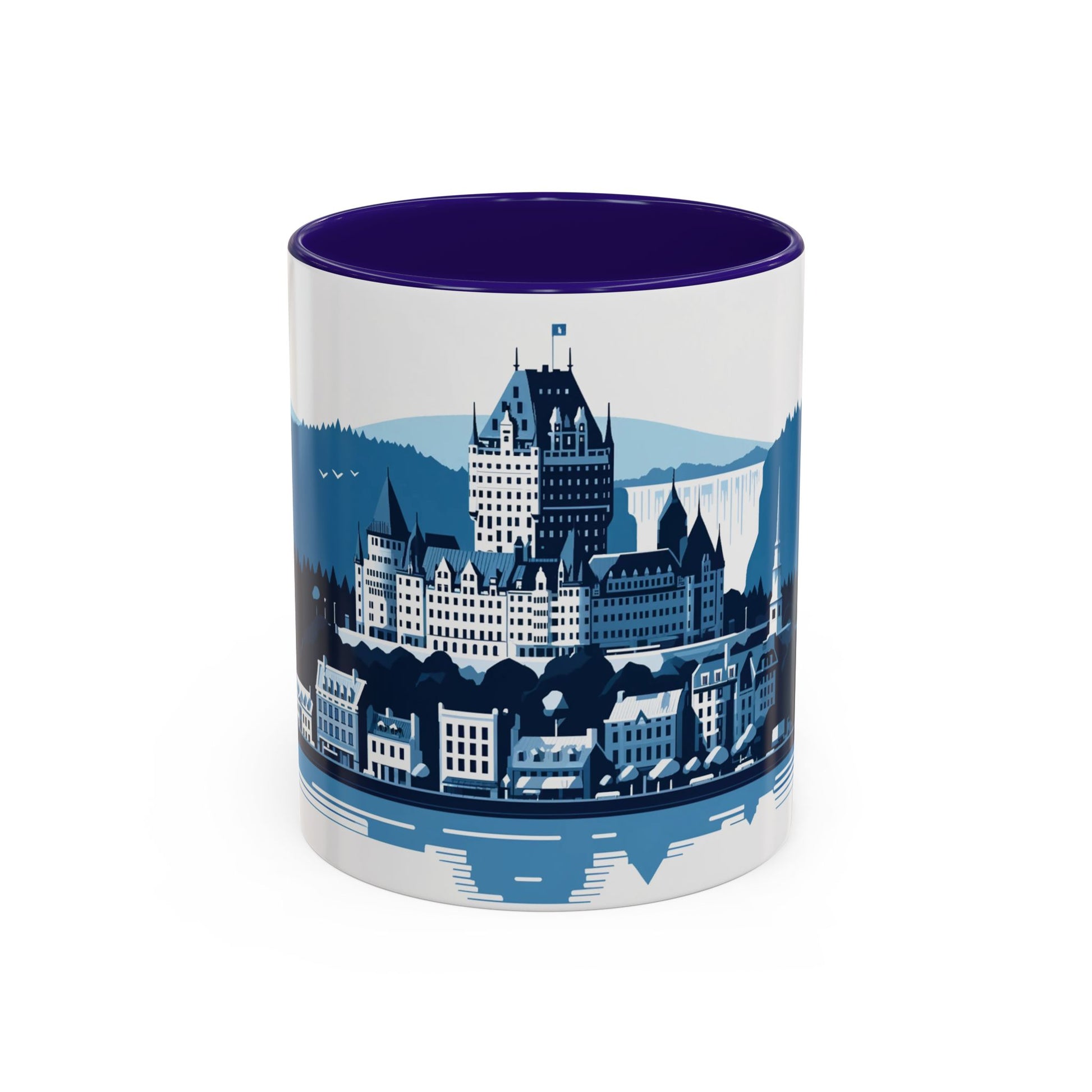 Imagine a coffee mug that captures the essence of Quebec City through an artistic depiction of its unique charm and character. The design features classic European-style buildings with steeply pitched roofs and detailed window shutters line the streets, evoking a sense of timeless elegance. In the background, lush trees in varying shades of blue create a serene, natural backdrop, blending seamlessly with the urban landscape. This coffee mug perfectly encapsulates the idyllic and charming spirit of Quebec City, making each sip a delightful experience.