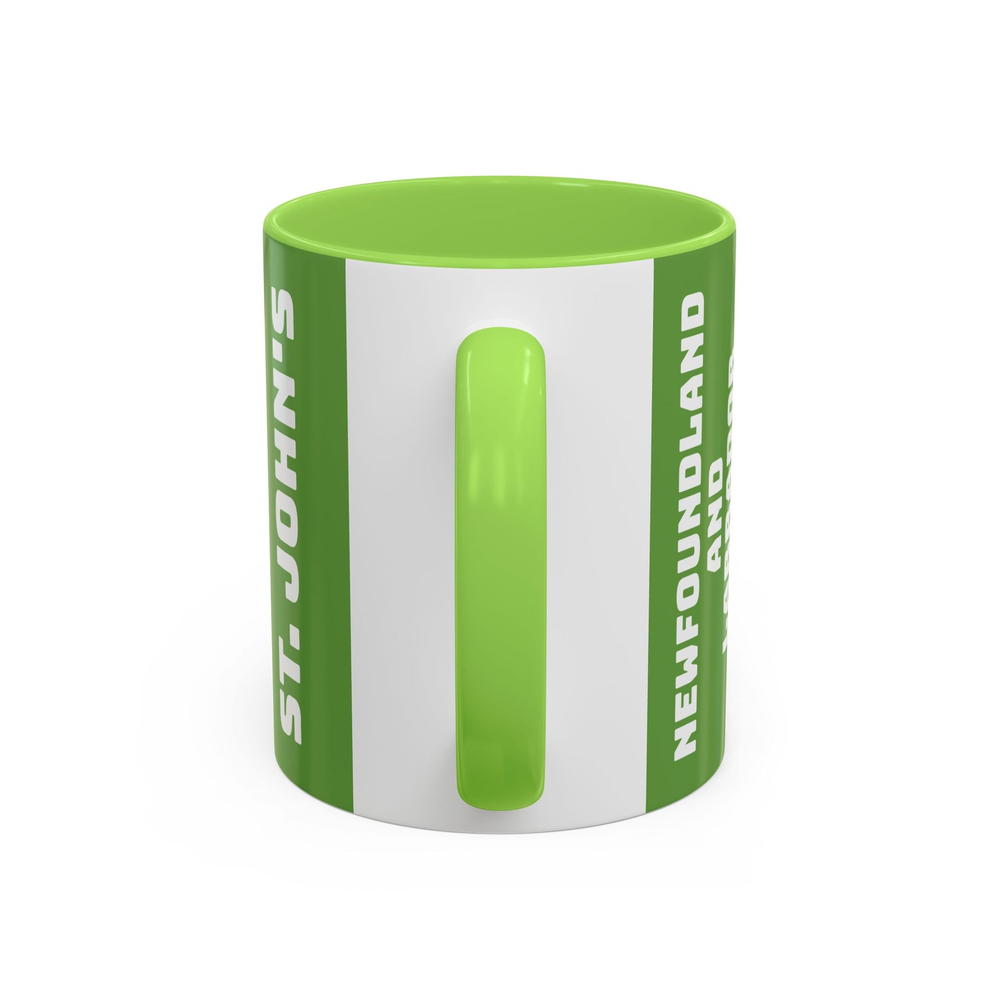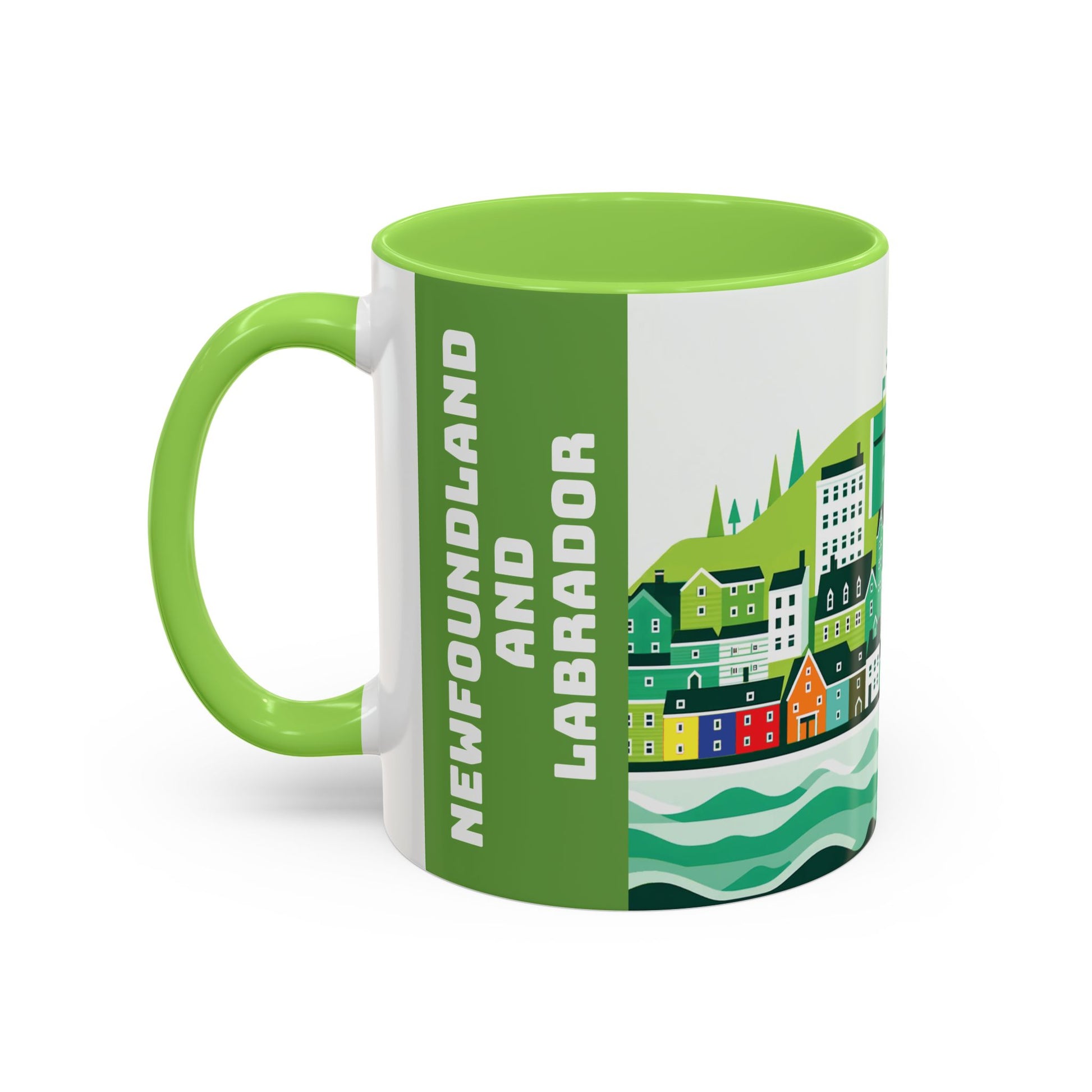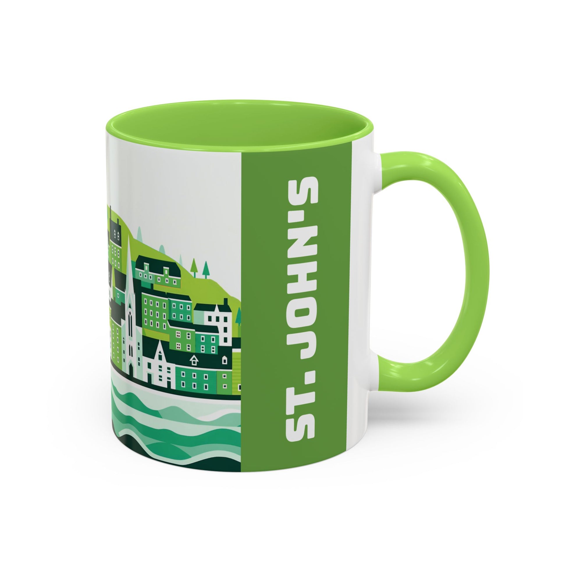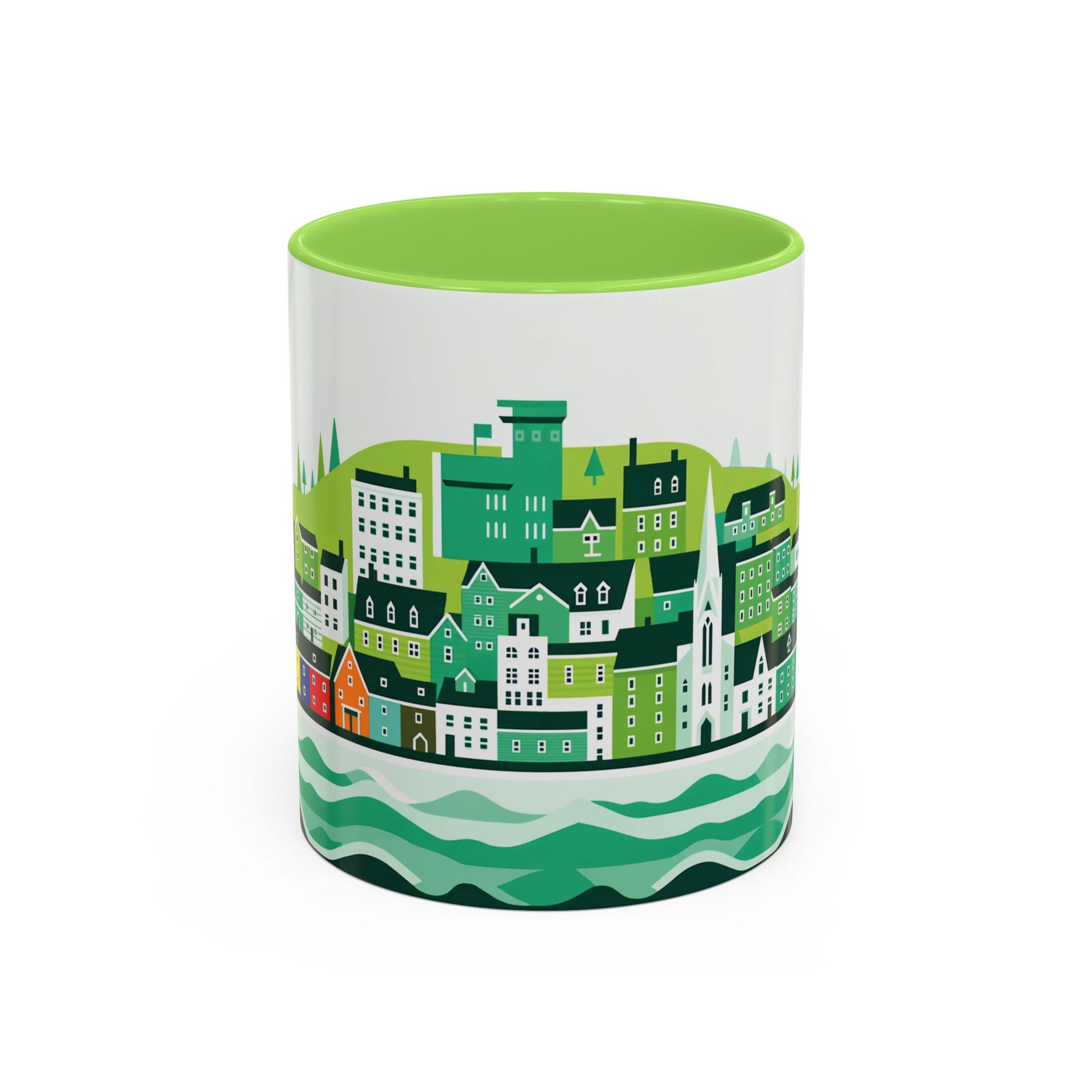 Introducing our exclusive coffee mug featuring a stunning illustration of St. John's, Newfoundland. This design captures the essence of the vibrant cityscape, showcasing the unique charm and colorful houses. Set against a backdrop of layered, minimalist elements in a striking light green theme, this mug is a perfect blend of modern aesthetics and beauty. Ideal for coffee lovers and admirers of St. John's alike, this mug brings a touch of Newfoundland's spirited character to your daily routine. Enjoy your favorite brew while savoring the picturesque scenery that this beautiful city has to offer.